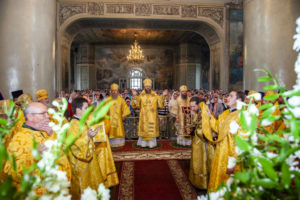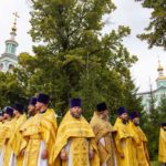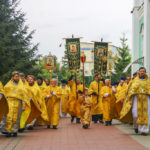 В завершение Литургии был совершен праздничный молебен с крестным ходом по территории Спасо-Преображенского собора.